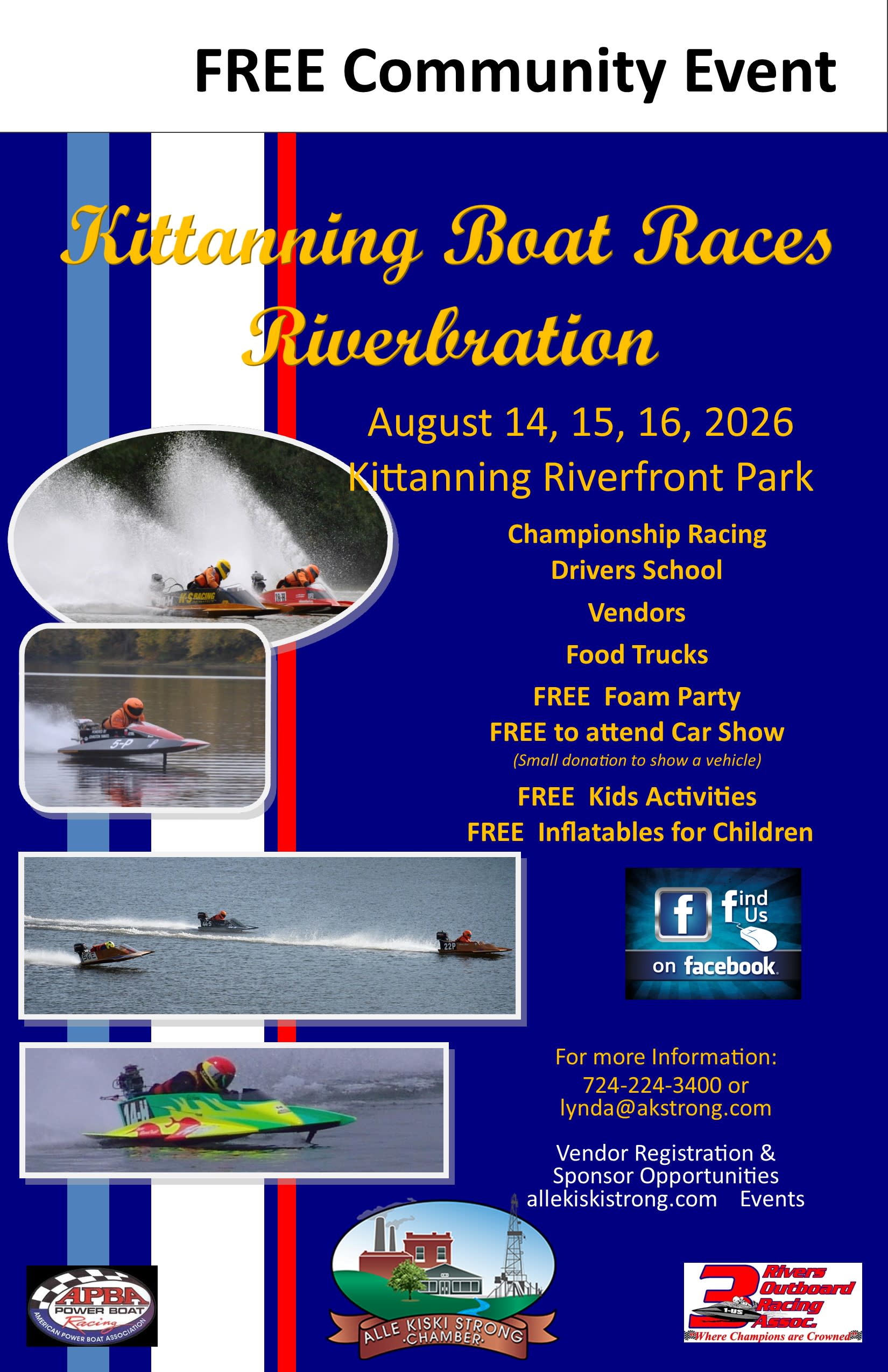 3 day free to attend community event. APBA Boat Racing, Vendors, Kids Activities, Car Show, Foam Party and much much more! All activities are FREE! Obstacle Course, Bounce House, Wagon Rides, Movie, Foam Party, Car ShowImages